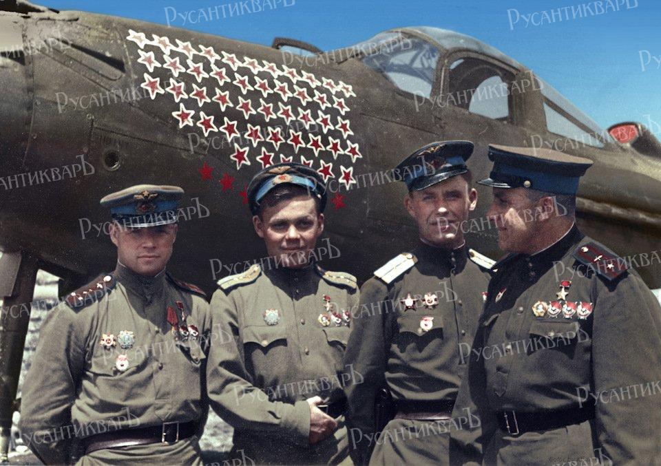 Летчики-асы 9-ой гвардейской авиационной дивизии у истребителя Белл P-39 «Аэрокобра» Г.А. Речкалова. Слева направо: А. Ф. Клубов (дважды Герой Советского Союза, сбил 31 самолет лично, 19 — в группе), Г. А. Речкалов (дважды Герой, сбил 56 самолетов лично и 6 — в группе), А. И. Труд (Герой Советского Союза, 25 самолетов сбил лично и 1 в группе) и командир 16-го гвардейского истребительного авиаполка Б. Б. Глинка (Герой Советского Союза, сбил 30 самолетов лично и 1 в группе). 2-й Украинский фронт. Фотография сделана в июне 1944 года на 2-ом Украинском фронте, у самолета Речкалова, количество звезд соответствует его достижениям к тому времени (46 самолетов сбито лично, 6 в группе).