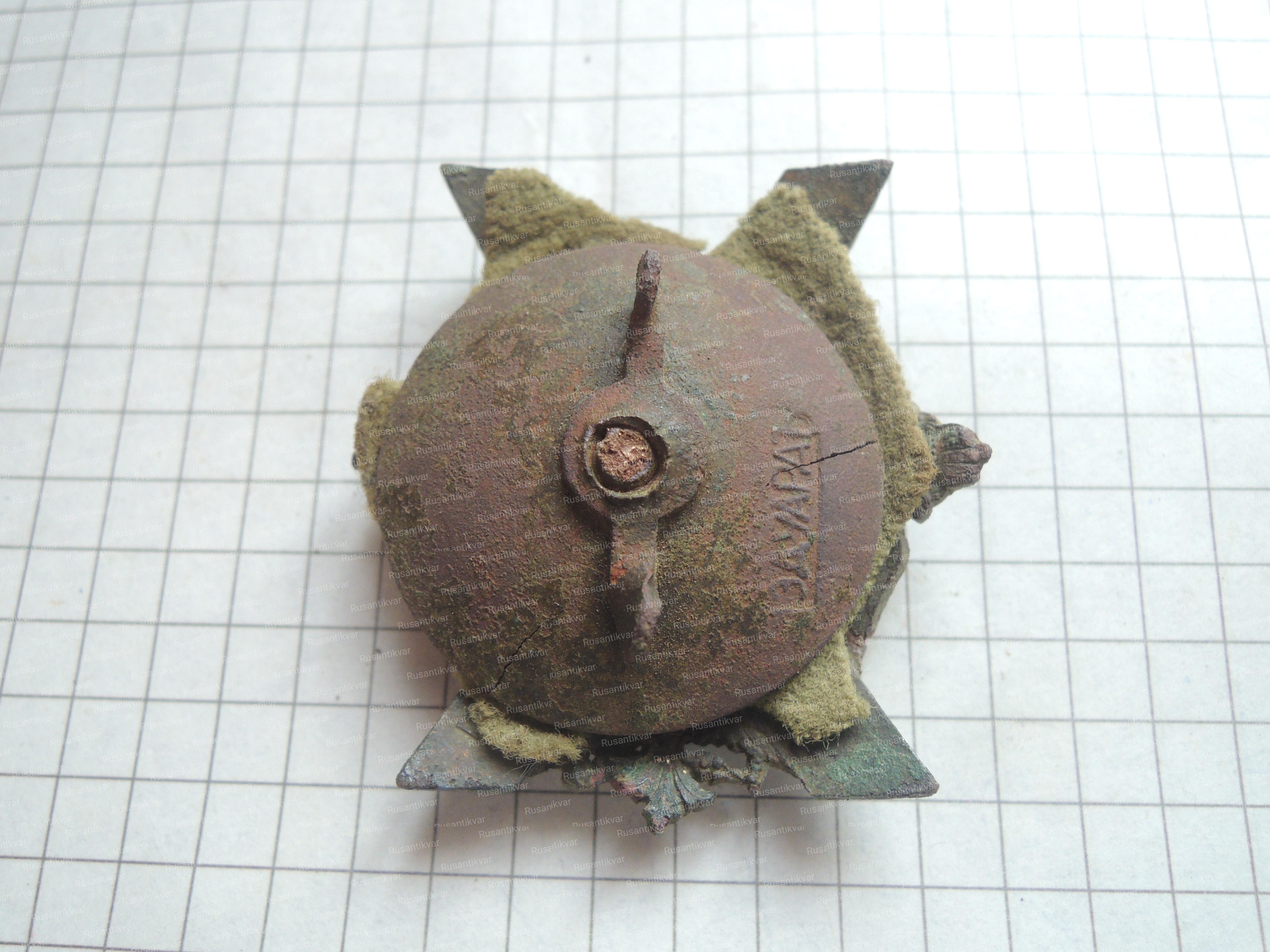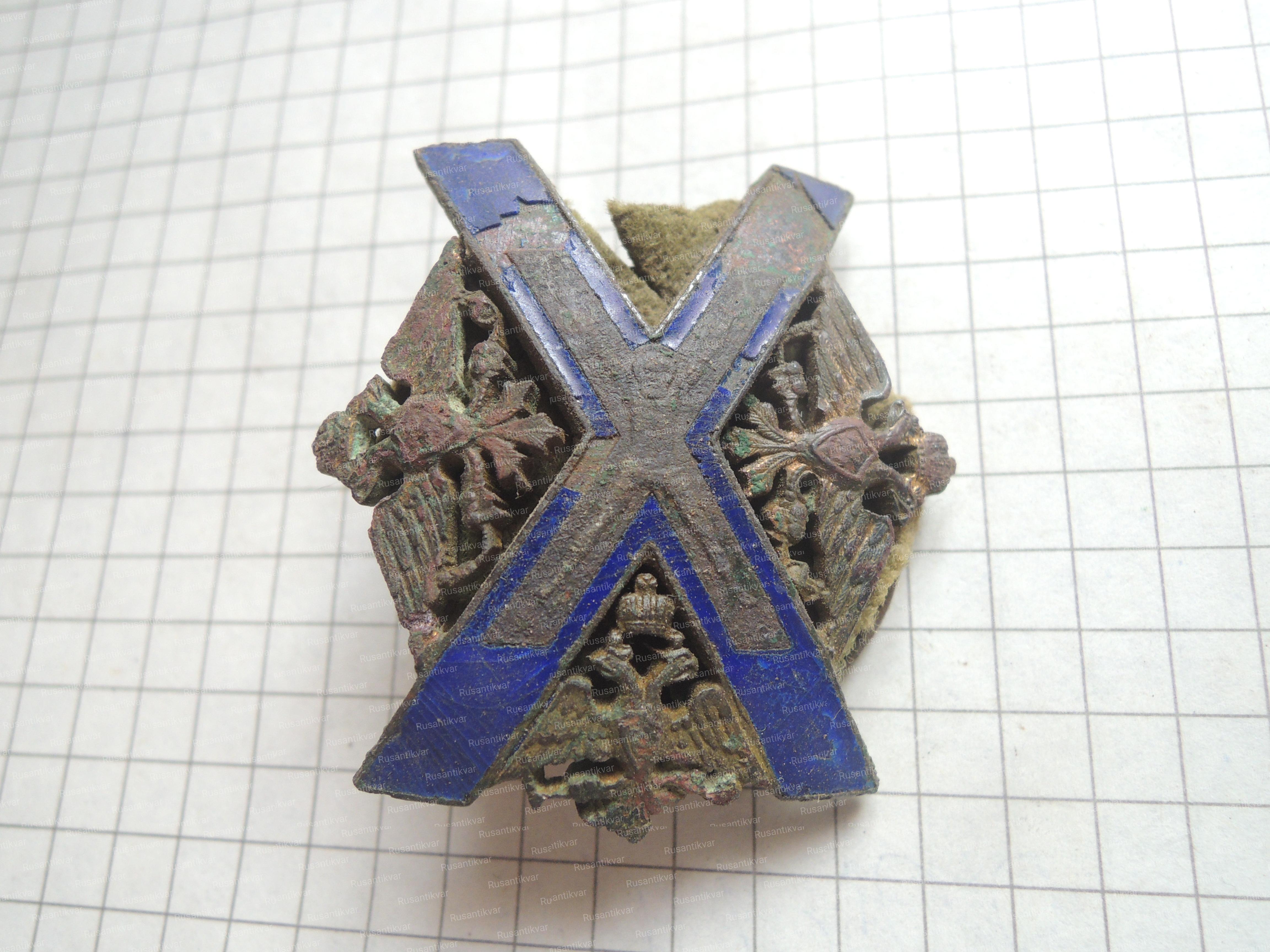 Вот полковой знак первого полка Императорской Гвардии Преображенский полк, как видно по сохранившемуся куску от защитного мундира корона была отломана специально.