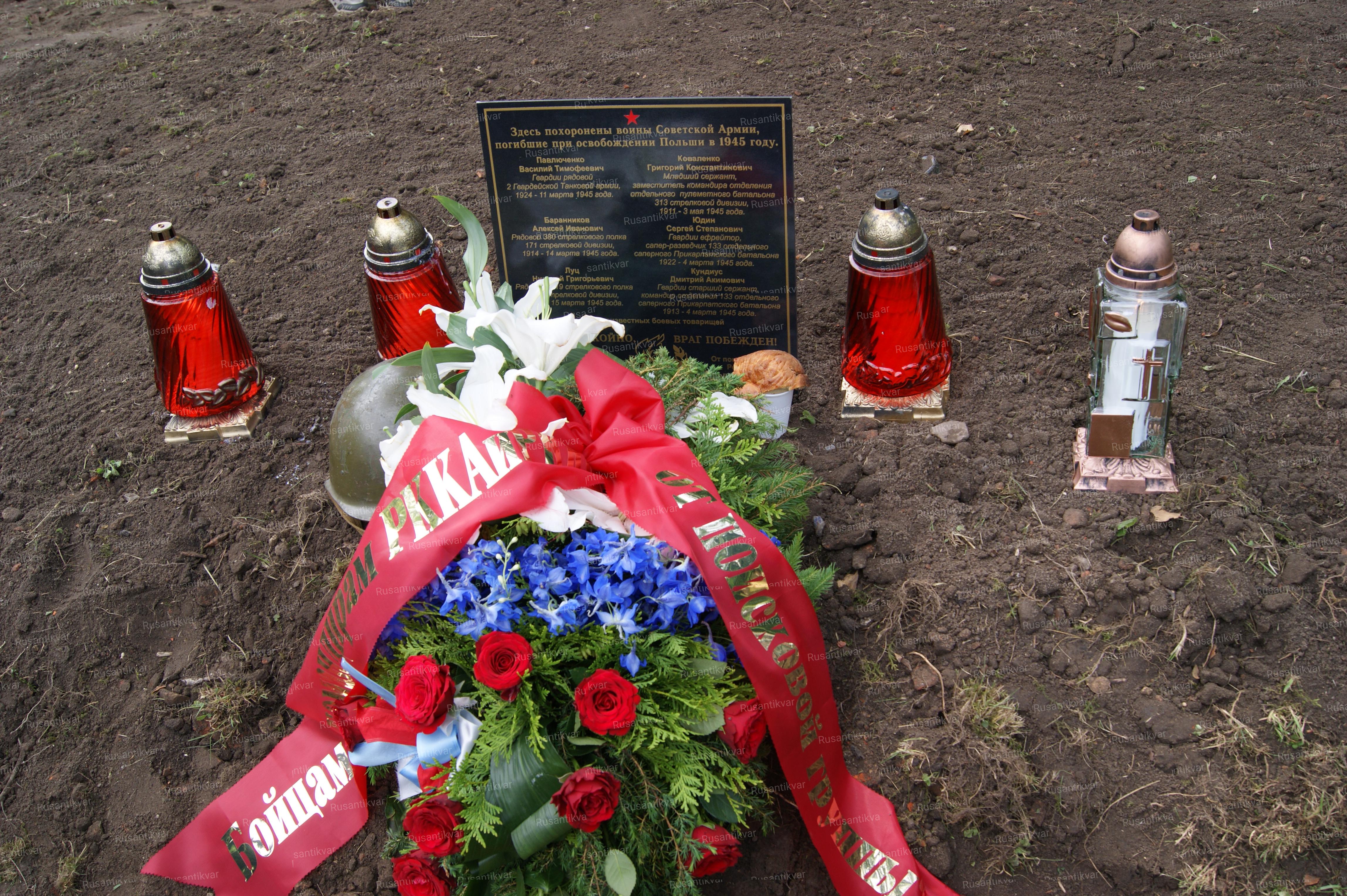 Незадолго до отъезда в Польшу, мы заказали памятную табличку с шестью солдатскими именами, чтобы установить ее на могиле. В самом низу поместили текст, списанный с военной фотографии одной из братских могил: «Спите спокойно, враг побежден».