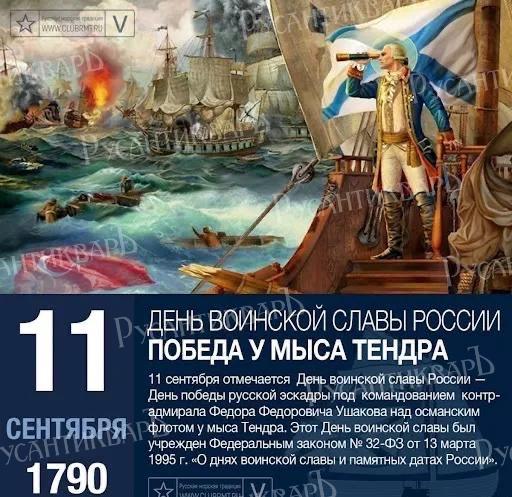 Федеральный закон от 13 марта 1995 года № 32-ФЗ «О днях воинской славы и памятных датах России» установил день воинской славы 11 сентября — День победы русской эскадры под командованием Ф. Ф. Ушакова над турецкой эскадрой у мыса Тендра.В действительности сражение завершилось 29 августа(9 сентября) 1790. Дата 11 сентября является ошибочной и не соответствует общепринятой в научном мире хронологии.