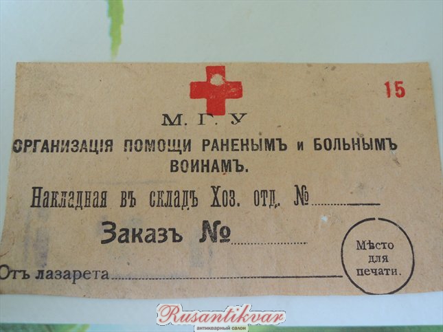 Накладная на получения мед. имущества от военных лазаретов. Из моей коллекции.