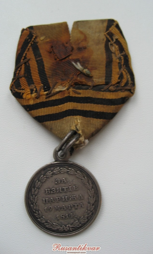 Медаль "за взятие Парижа", утвержденная манифестом императора Александром 1 от 30 августа 1814 года предназначалась для офицеров и нижних чинов, находившихся в составе действующей армии до 19 марта 1814 год, известна ныне во многих экземплярах, отличающихся от утвержденного образца.